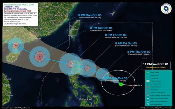 Sáng 2.10, Cục Quản lý Thiên văn, Địa vật lý và Khí tượng Philippines (PAGASA) phát tin bão khẩn cấp cho biết, áp thấp nhiệt đới Paolo đã mạnh lên thành bão. Vào hồi 4h sáng 2.10, vị trí tâm bão ở 14,6 độ Vĩ Bắc, 128,2 độ Kinh Đông, cách tỉnh Quezon (Philippines) khoảng 705km về phía Đông.