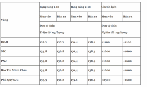 Các thương hiệu SJC, PNJ, Bảo Tín Minh Châu đồng loạt niêm yết giá vàng miếng ở ngưỡng 136,4 – 138,4 triệu đồng/lượng (mua vào – bán ra), tăng 1,6 triệu đồng/lượng ở cả hai chiều.