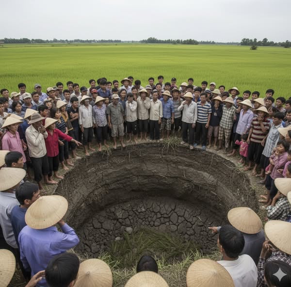Một hố sụt lún rộng khoảng 100m², sâu hơn 10m, xuất hiện giữa cánh đồng ở Tuyên Quang. Lực lượng chức năng đã lập rào chắn, khuyến cáo người dân không lại gần khu vực này.