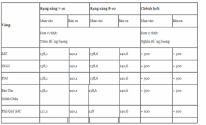 Riêng vàng Phú Quý SJC mua vào 138 triệu đồng/lượng, thấp hơn các thương hiệu khác 600.000 đồng/lượng; bán ra 140,6 triệu đồng/lượng, bằng giá với các thương hiệu khác .