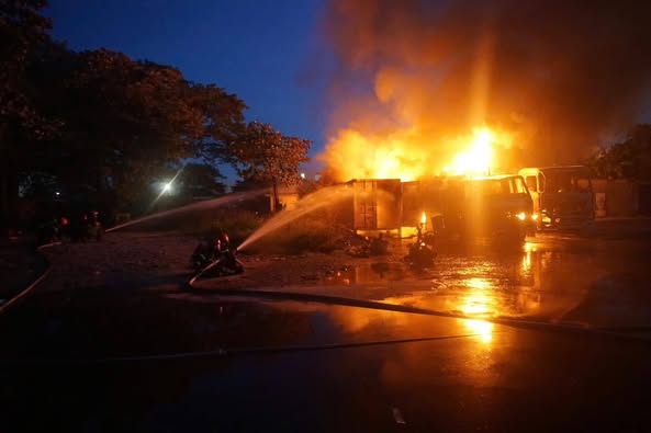 Tại khu vực bãi xe phía sau cửa hàng xăng dầu Petrolimex số 9 (TP Đà Nẵng), hai xe bồn chở xăng dầu bốc cháy ngùn ngụt.