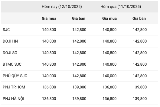 Theo đó, giá vàng miếng SJC tại Công ty VBĐQ Sài Gòn SJC niêm yết ở mức 140,8 – 142,8 triệu đồng/lượng (mua vào và bán ra), giữ nguyên so với phiên sáng. Chênh lệch mua bán vẫn ở mức 2 triệu đồng/lượng. Tập đoàn DOJI và Bảo Tín Minh Châu cũng niêm yết cùng mức giá này, cho thấy sự ổn định tạm thời sau chuỗi ngày tăng “nóng”.