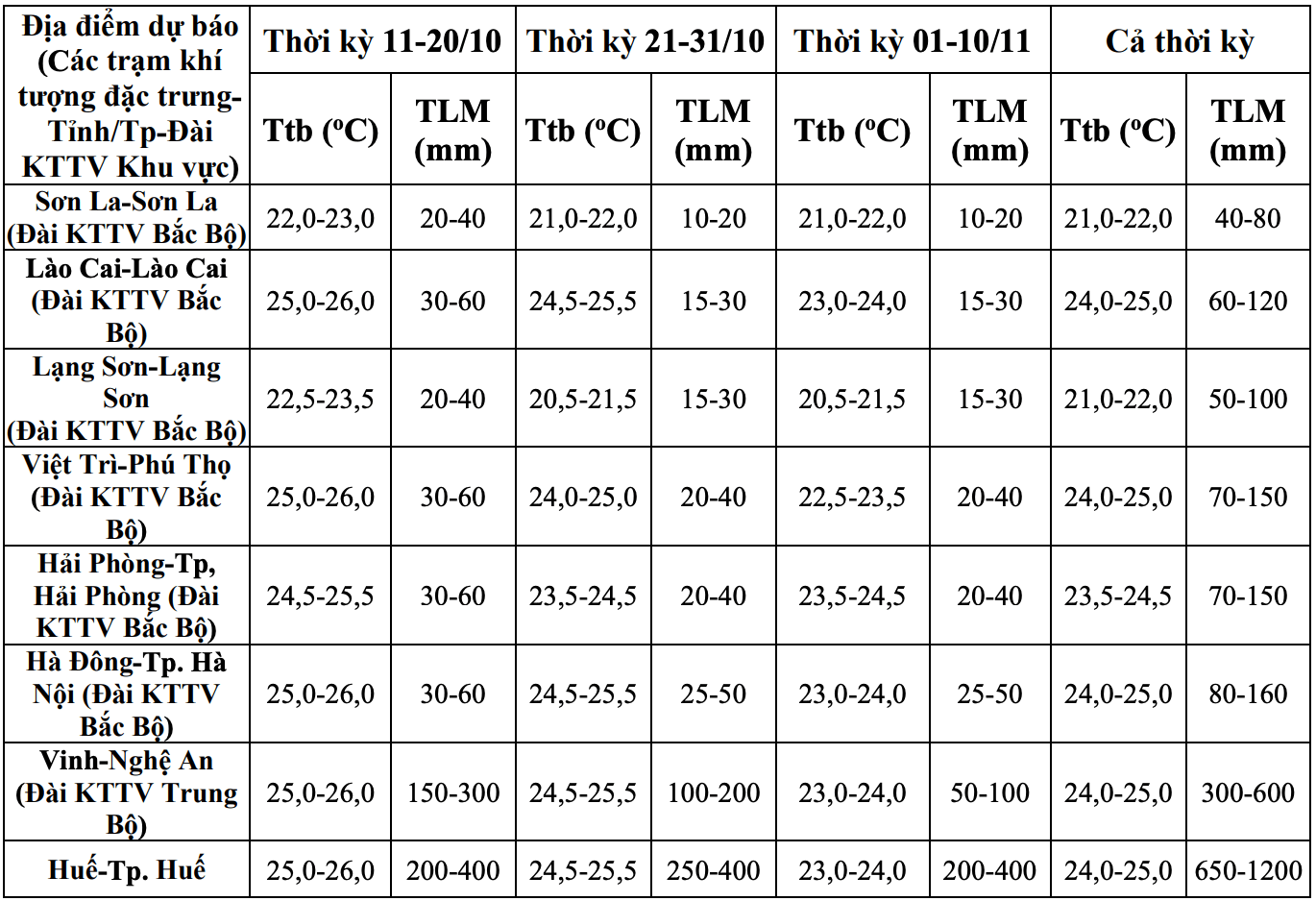 Dự báo nhiệt độ trung bình, lượng mưa ở một số trạm quan trắc trong thời kỳ từ nay đến ngày 10.11. Nguồn: Trung tâm Dự báo Khí tượng Thủy văn Quốc gia