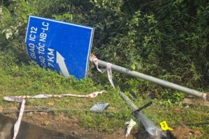 Tại hiện trường, một số hạng mục giao thông bị hư hỏng do vụ tai nạn. Trong hình là một cột biển báo giao thông bị ô tô khách húc đổ.