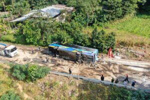 Tại hiện trường, chiếc xe khách lật nghiêng, xăng dầu chảy tràn ra mặt đường tỉnh lộ 172. Từ trên cao có thể thấy khu vực xảy ra tai nạn là đoạn đường vừa hết khúc cua tay áo.