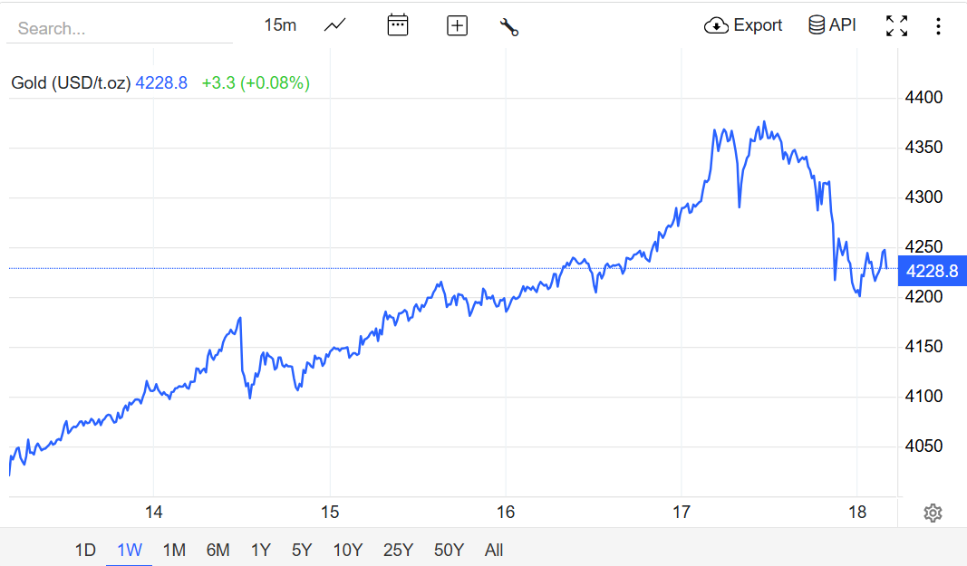 Giá vàng thế giới giao ngay chốt phiên tại thị trường Mỹ vào rạng sáng nay 18/10 (giờ Việt Nam) ở quanh gần mức 4.228 USD/ounce, giảm mạnh so với thời điểm cao nhất trong ngày gần 150 USD/ounce. Mặc dù vậy, tăng mạnh hơn 213 USD/ounce so với chốt phiên tuần trước đó tại thị trường này.