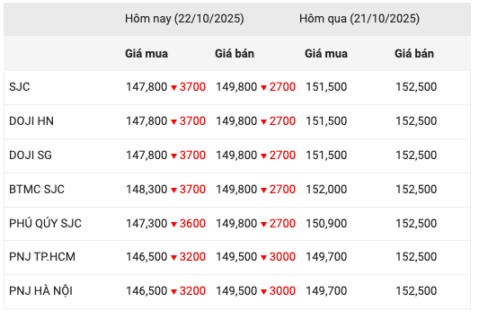 Theo khảo sát, giá vàng miếng SJC tại Tập đoàn DOJI hiện niêm yết ở mức 147,8 – 149,8 triệu đồng/lượng (mua vào và bán ra), giảm tới 3,7 triệu đồng ở chiều mua và 2,7 triệu đồng ở chiều bán. Công ty VBĐQ Sài Gòn (SJC) cũng ghi nhận mức tương tự, đưa giá mua bán về vùng 147,8 – 149,8 triệu đồng/lượng.