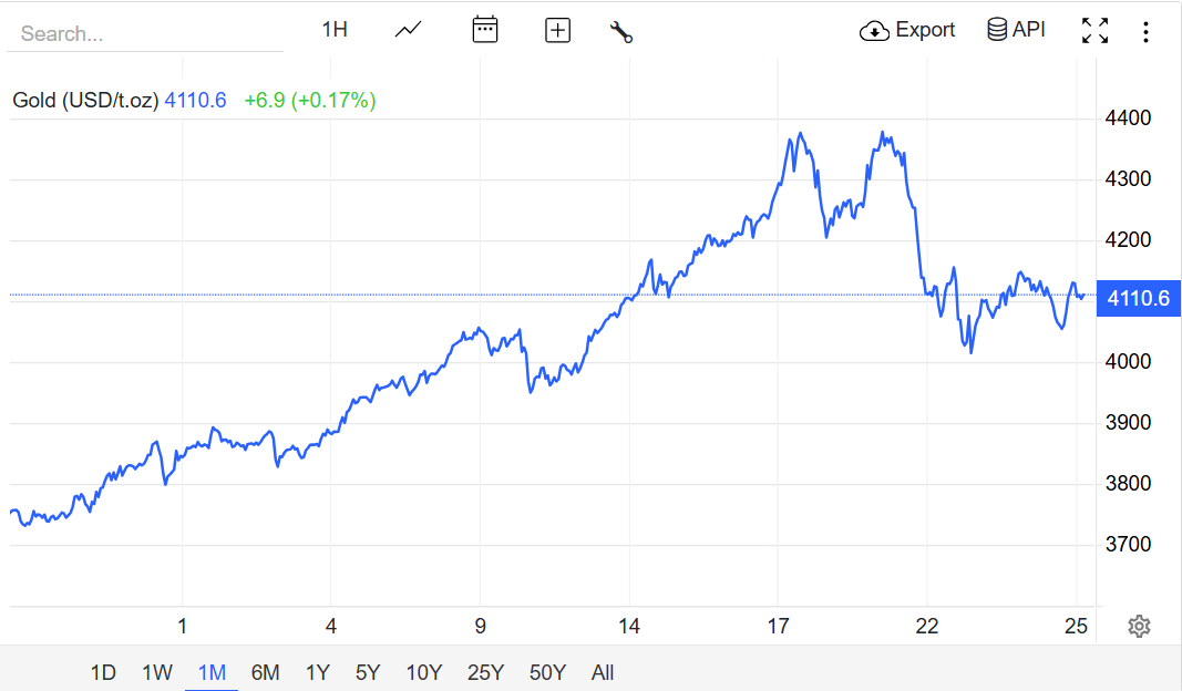 Giá vàng thế giới giao ngay chốt phiên tại thị trường Mỹ vào rạng sáng nay 25/10 (giờ Việt Nam) ở quanh gần mức 4.110 USD/ounce, giảm 16 USD/ounce so với chốt phiên trước đó tại thị trường này. Đặc biệt, giảm mạnh hơn 118 USD/ounce so với chốt phiên tuần trước đó tại thị trường này.