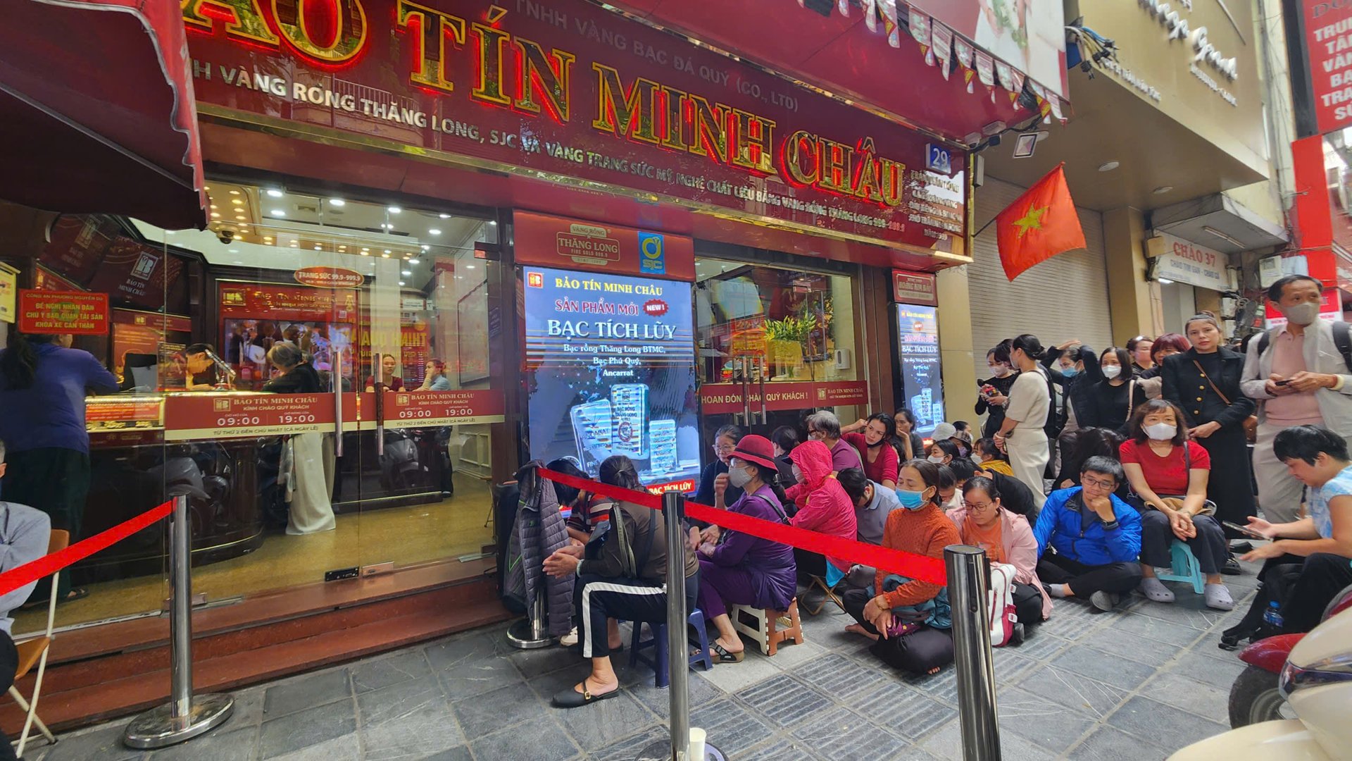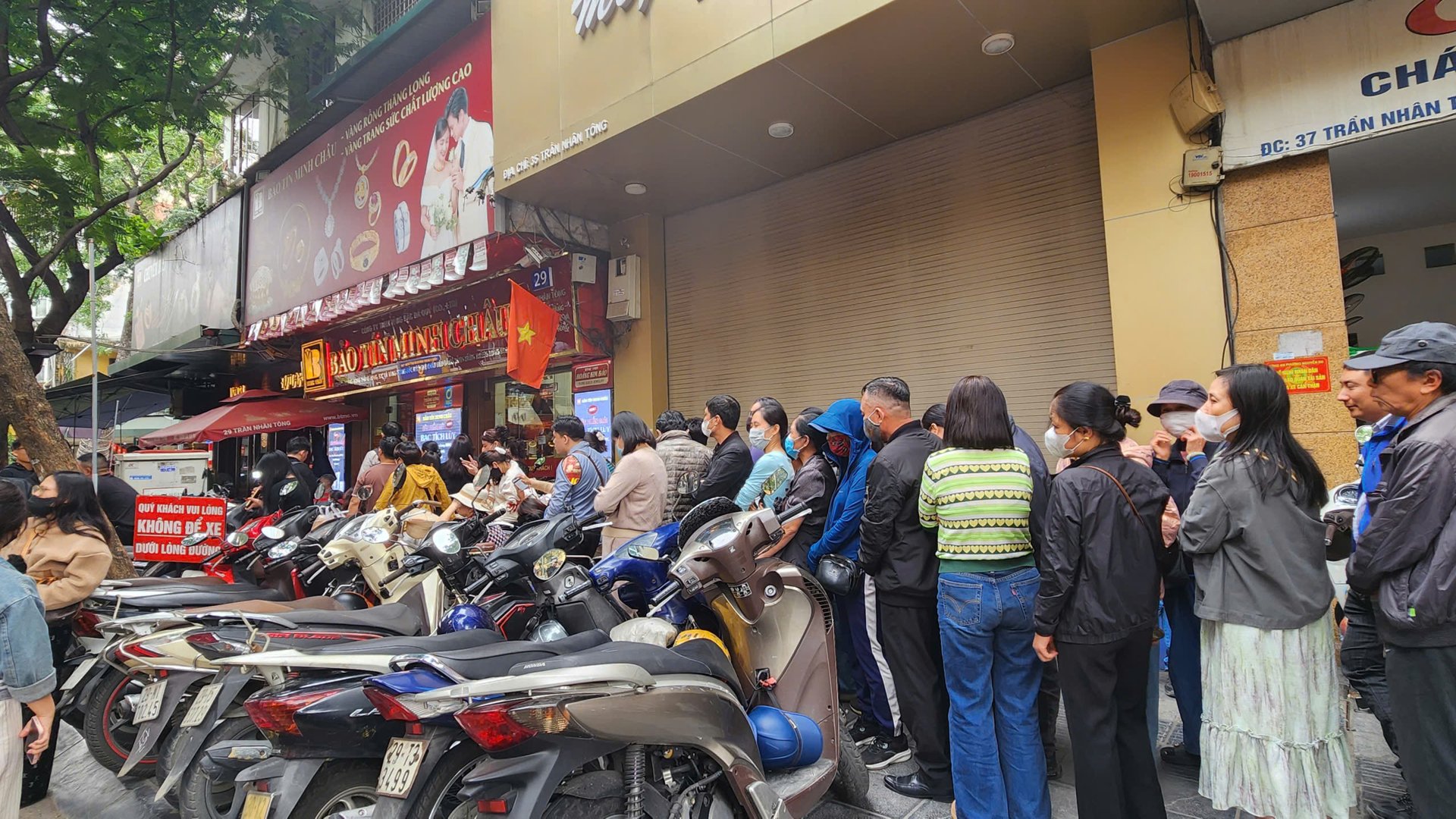 Đến thời điểm 13 giờ ngày 25/10, 2 cửa hàng vàng Bảo Tín Minh Châu tại phố Trần Nhân Tông vẫn “thất thủ”, dòng người xếp hàng xuyên trưa tiếp tục nối dài, tràn sang cả các nhà lân cận và xuống lòng đường. Nhiều người dân cho biết, một số hôm trước đó, cửa hàng cũng thông báo dừng bán nhưng sau đó đến buổi chiều lại phát số thứ tự cho khách mua nên quyết tâm chờ đợi.