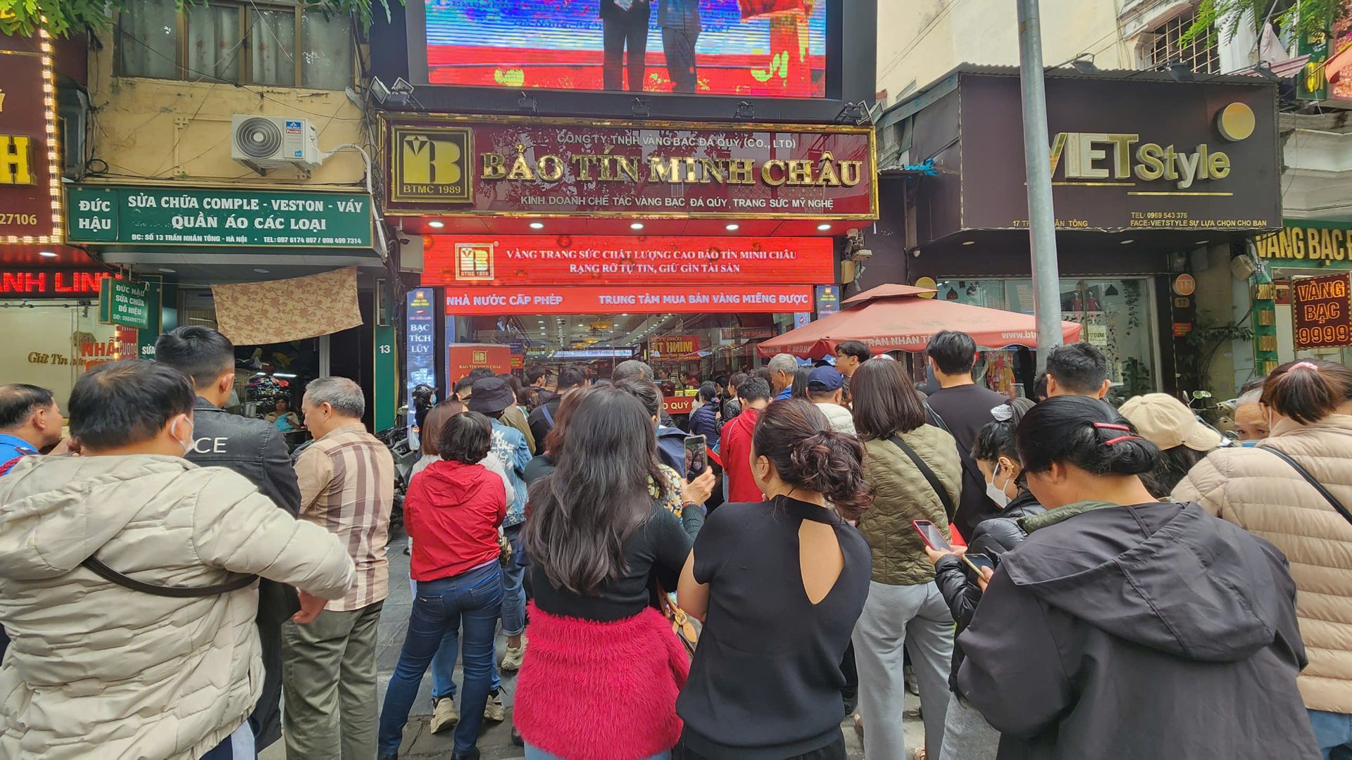 Giá vàng hôm nay mới nhất đảo chiều tăng vọt: Người dân mua vàng vây kín cửa hàng, tràn xuống cả lòng đường tại phố Trần Nhân Tông, Hà Nội. Ảnh: Thái Nguyễn