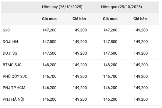 Giá vàng trong nước hôm nay 26/10