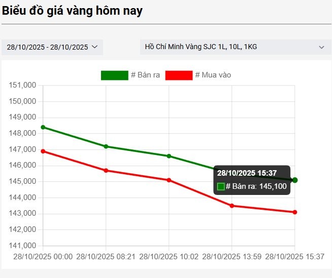 Sáng 28/10, Công ty Vàng bạc đá quý Sài Gòn (SJC) đã buộc phải thực hiện điều chỉnh biểu giá vàng miếng lần thứ hai. Theo đó, giá vàng miếng SJC niêm yết tại 145,1 – 146,6 triệu đồng/lượng, đánh dấu sự sụt giảm đáng kể ngay từ đầu phiên. Tuy nhiên, đà giảm không dừng lại ở đó.