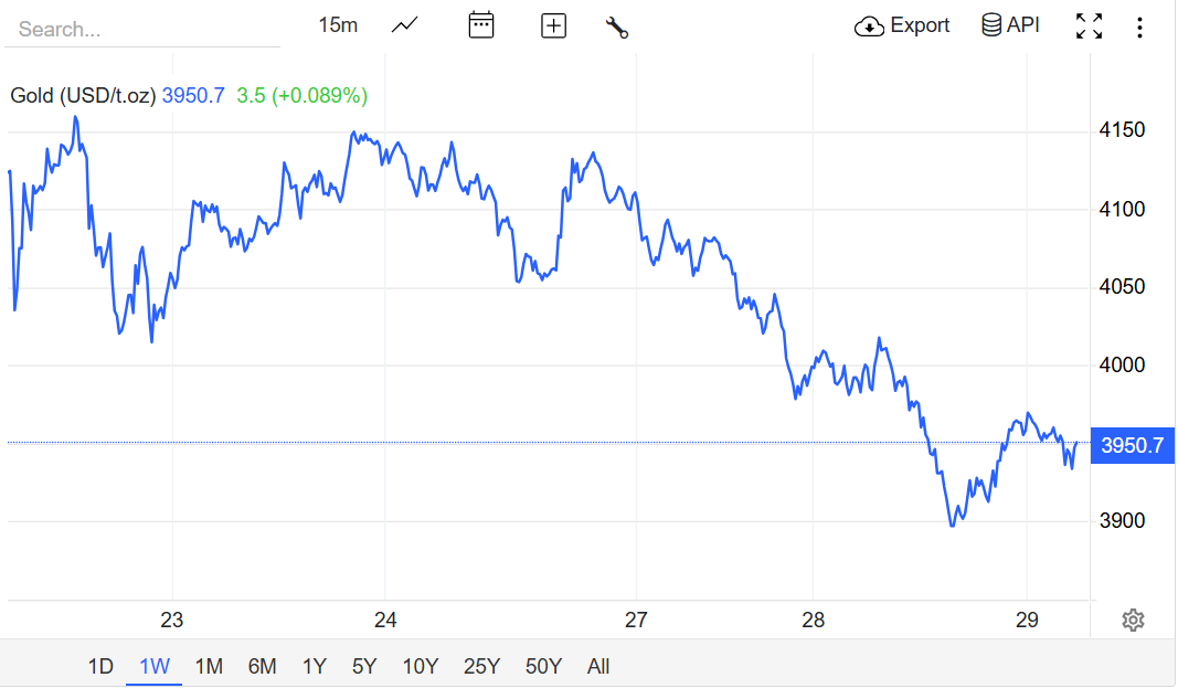 Giá vàng giao ngay trên sàn New York tối 28/10 (giờ Việt Nam) tiếp tục giảm sâu. Trước đó, trên thị trường châu Á, vàng đã mất mốc 4.000 USD/ounce, rồi xuyên thủng cả ngưỡng 3.900 USD/ounce, trước khi hồi phục nhẹ lên 3.930 USD/ounce.