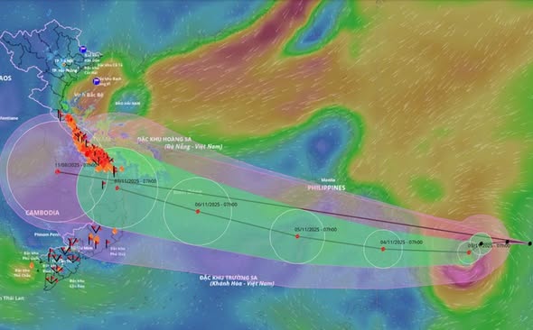 Khoảng 7 giờ ngày 4.11, vị trí tâm bão có tên quốc tế là Kalmaegi vào khoảng 10,7 độ vĩ bắc, 123,5 độ kinh đông (trên khu vực miền trung Philippines), sức gió mạnh nhất vùng gần tâm bão mạnh cấp 13, giật cấp 16.
