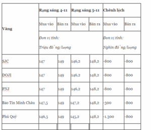 Giá vàng miếng trong nước cập nhật sáng 5-11 như sau: