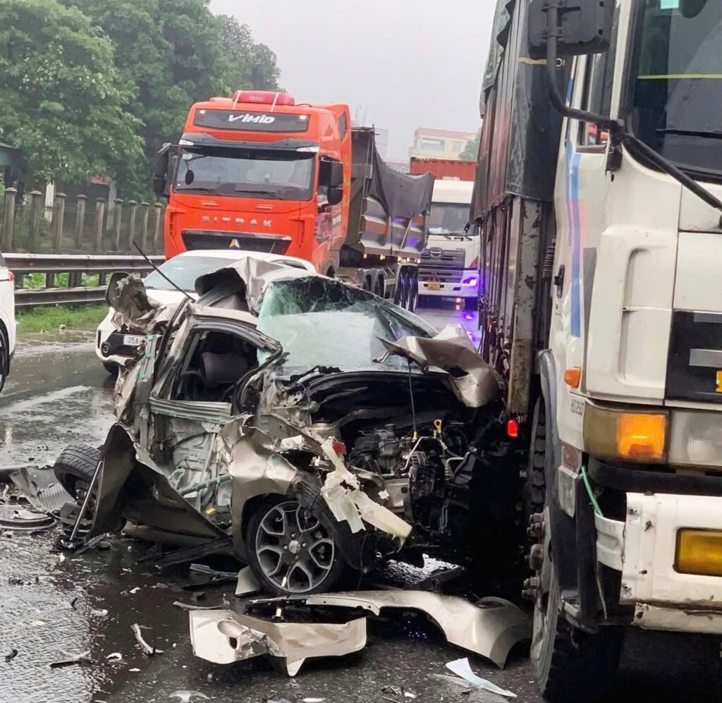 Cú va do xe đầu kéo đâm vào đuôi xe con, khiến chiếc xe con văng mạnh vào gầm sau xe tải. Cả 3 phương tiện bị hư hỏng.