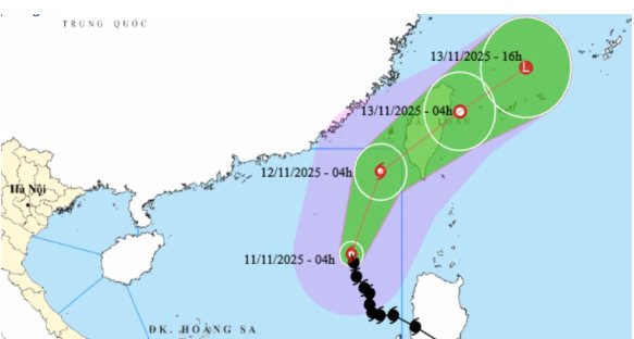 Đến 4 giờ ngày 13-11, vị trí tâm bão ở khoảng 24,3 độ Vĩ Bắc; 122,2 độ Kinh Đông, trên vùng biển phía Đông đảo Đài Loan (Trung Quốc). Bão suy yếu dần thành áp thấp nhiệt đới, sức gió mạnh nhất vùng gần tâm cấp 7, giật cấp 9.
