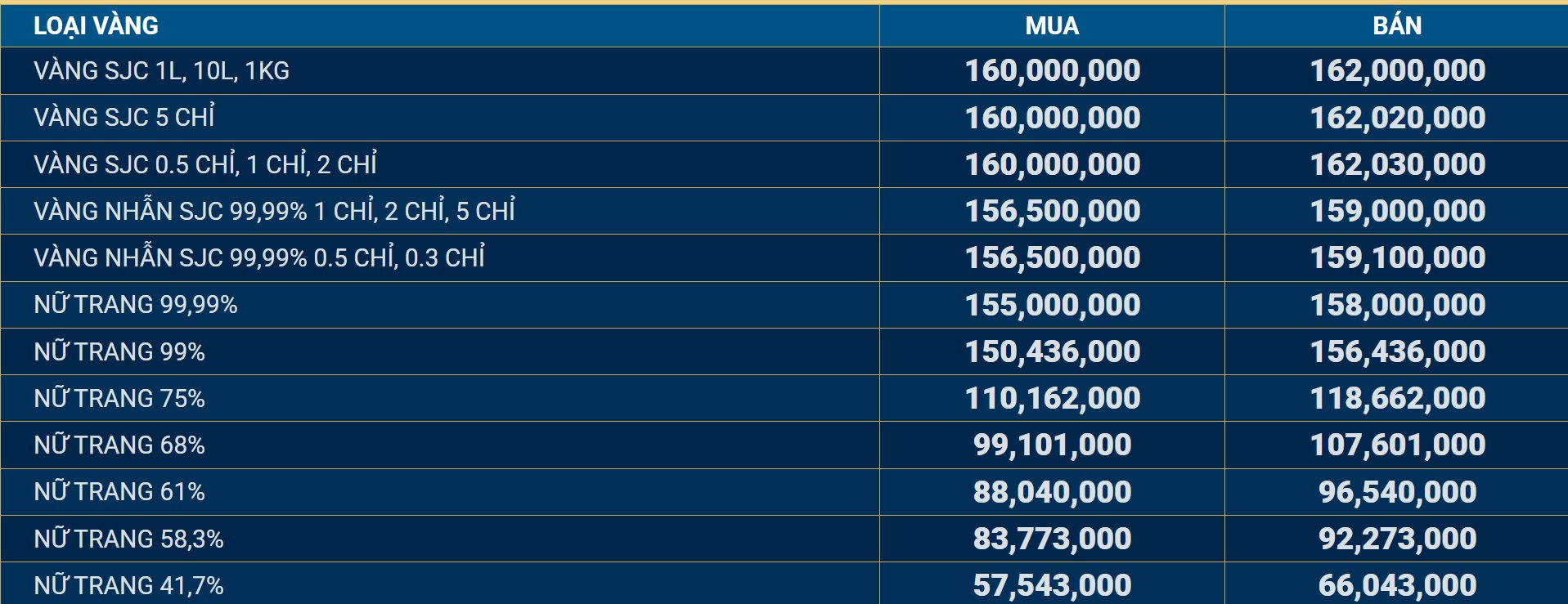 Tại trị trường trong nước, cập nhật lúc 10h sáng nay, giá vàng đang được các doanh nghiệp niêm yết quanh mốc 160 triệu đồng/lượng chiều mua vào và 161 – 162 triệu đồng/lượng chiều bán ra.