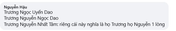 Ví dụ như Trương Ngọc Uyển Dao, Trương Nguyễn Uyển Giao, Trương Nguyễn Tâm Dao, Trương Nguyễn Ngọc Dao, Nguyễn Tòng Tâm Dao, Nguyễn Tâm Dao, Nguyễn Uyển Dao,Trương Nguyễn Ngọc Uyển …