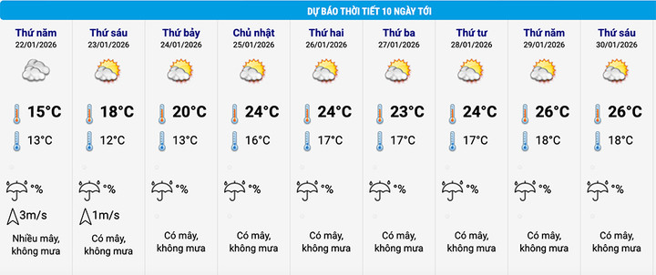 Trong hai ngày cuối thời kỳ dự báo (29-30/1), nhiệt độ ban ngày ở Hà Nội tăng nhẹ lên cao nhất 26°C, nhiệt độ thấp nhất buổi đêm khoảng 18°C.