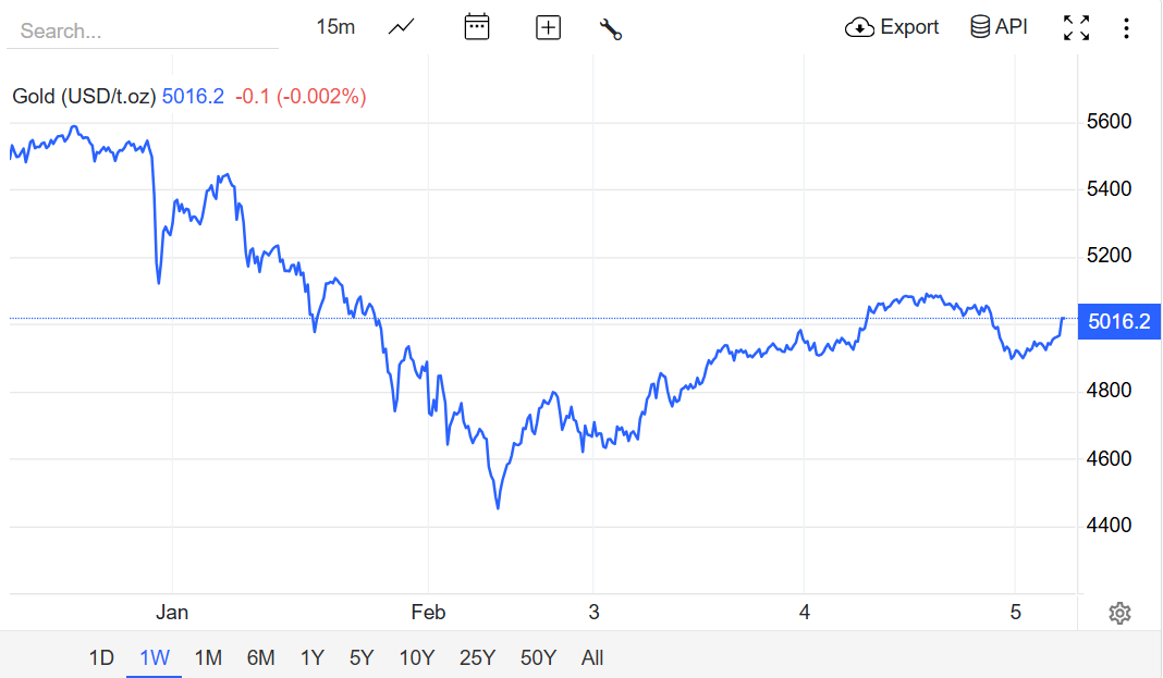 Thị trường kim loại quý ngày 5/2/2026 tiếp tục ghi nhận những diễn biến kịch tính khi giá vàng miếng SJC và vàng nhẫn 9999 tại các thương hiệu lớn như Bảo Tín Mạnh Hải, SJC, Bảo Tín Minh Châu… đồng loạt giữ mức cao kỷ lục, dù giá vàng thế giới bắt đầu xuất hiện những nhịp rung lắc mạnh quanh ngưỡng 5.000 USD/ounce.