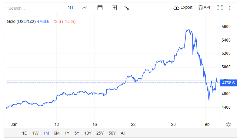 Đến 23h27 ngày 2/2, giá vàng giao ngay tụt sâu xuống 4.678 USD/ounce, giảm tới gần 4%.