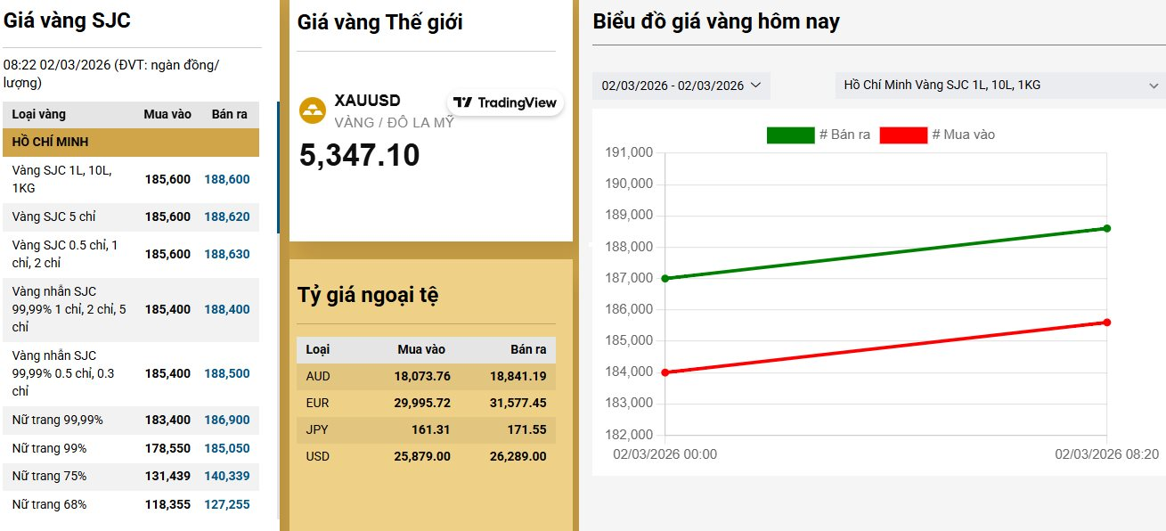 Ghi nhận vào sáng ngày 02/03/2026 , doanh nghiệp đồng loạt điều chỉnh biểu giá theo chiều thẳng đứng. Cụ thể, vàng miếng SJC hiện đang niêm yết ở mức 185,6 triệu đồng/lượng (mua vào) và 188,6 triệu đồng/lượng (bán ra). So với chốt phiên cuối tuần trước, mỗi lượng vàng miếng đã tăng thêm khoảng 1,6 triệu đồng.