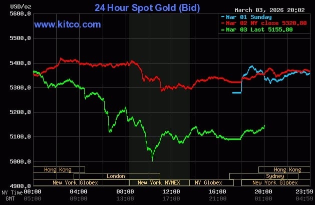 Sau khi nhích nhẹ sáng 3/3, giá vàng thế giới giao ngay bắt đầu giảm mạnh từ chiều. Giá có thời điểm mất tới 320 USD buổi tối, xuống 5.000 USD một ounce. Chốt phiên, mỗi ounce vàng giảm 233 USD. Đến sáng 4/3, giá tăng nhẹ trở lại, hiện giao dịch tại 5.117 USD.