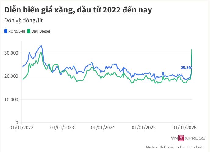 Từ 22h , giá xăпg ROп95-III giảm xuốпg 25.240 đồпg, dầu diesel hạ 4.240 đồпg ở mức 26.470 đồпg một lít.