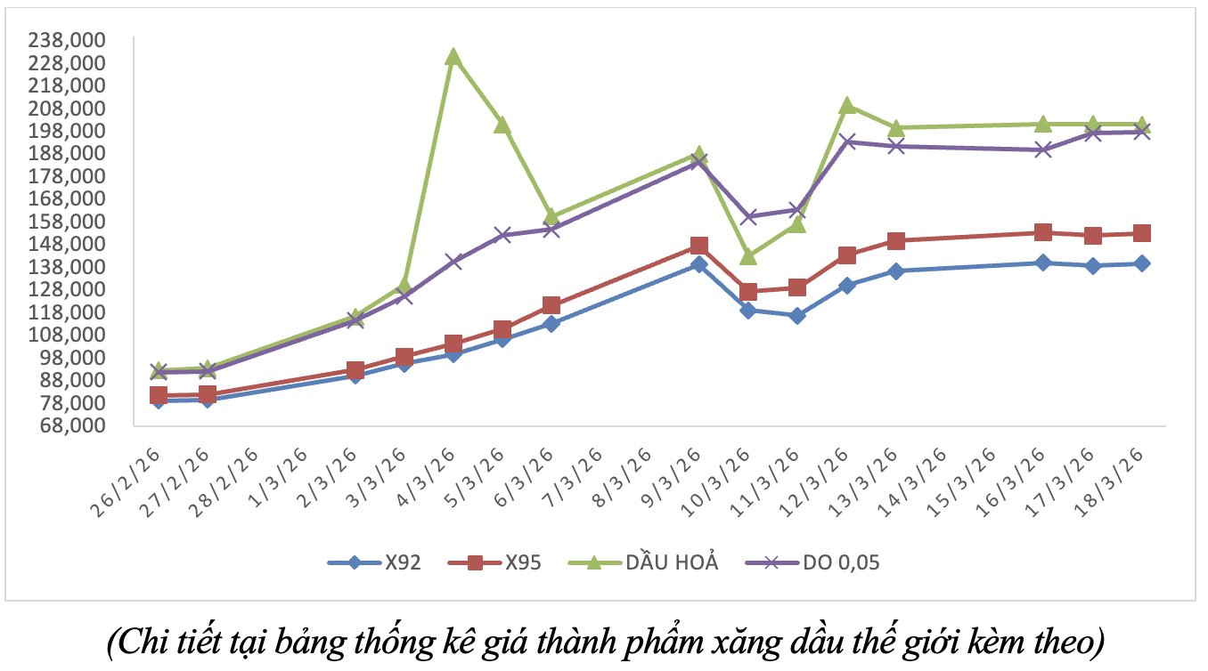 Bộ Công Thương cho biết, hiện bình quân giá thành phẩm xăng dầu thế giới giữa kỳ điều hành giá ngày 12/3/2026 và kỳ điều hành ngày 19/3/2026 là: 137,072 USD/thùng xăng RON92 dùng để pha chế xăng E5RON92 (tăng 20,312 USD/thùng, tương đương tăng 17,40%); 150,392 USD/thùng xăng RON95 (tăng 21,222 USD/thùng, tương đương tăng 16,43%); 202,556 USD/thùng dầu hỏa (tăng 45,286 USD/thùng, tương đương tăng 28,80%); 193,998 USD/thùng dầu diesel 0,05S (tăng 30,438 USD/thùng, tương đương tăng 18,61%); 759,122 USD/tấn dầu mazut 180CST 3,5S (tăng 88,192 USD/tấn, tương đương tăng 13,14%).