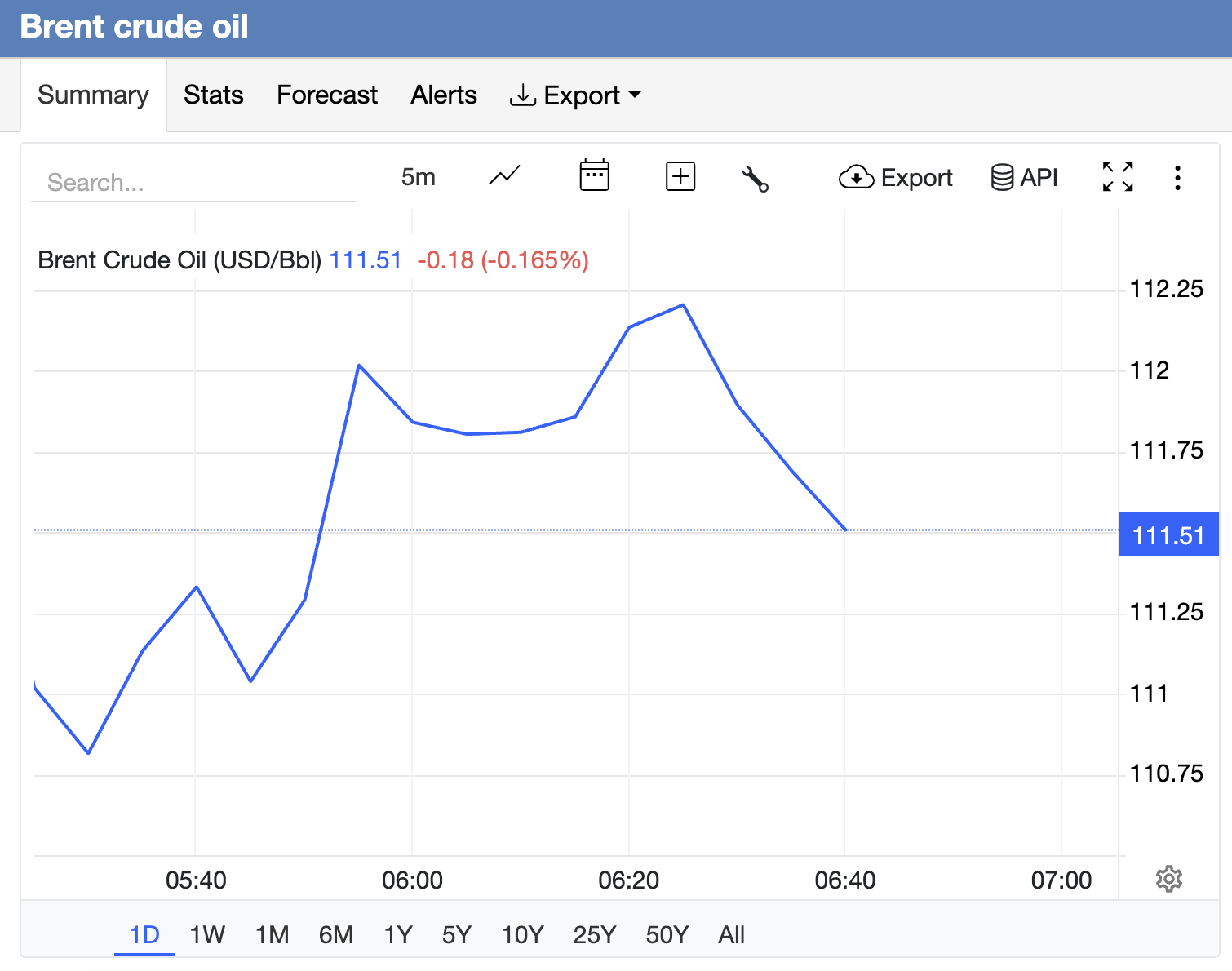 Trading Economics ghi nhận giá dầu Brent giao dịch quanh mức 112 USD/thùng vào thứ Hai sau khi tăng lên mức cao nhất là 115 USD vào đầu phiên giao dịch, khi các nhà đầu tư đánh giá tối hậu thư của Tổng thống Donald Trump thúc giục Iran mở lại eo biển Hormuz.