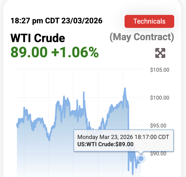 Sau cú lao dốc mạnh tối và đêm qua 23/3, dầu thô đi ngang trong phiên mở cửa sáng nay 24/3 (Ảnh: Trading Economics).