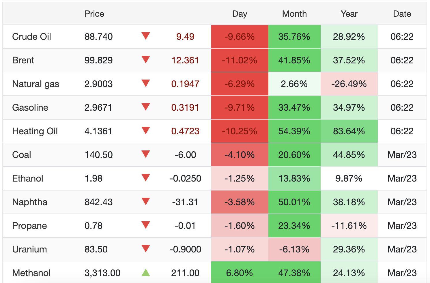 Giá dầu thô thế giới tăng rất cao trong mấy ngày gần đây, trong đó lúc 4 giờ ngày 23/3 dầu Brent tăng vượt 114,48 USD/thùng, lúc 16 giờ 15 phút ngày 19/3, giá dầu Brent lên ngưỡng 118 USD/thùng, gây lo ngại bất ổn nguồn cung xăng dầu thành phẩm trên toàn thế giới.