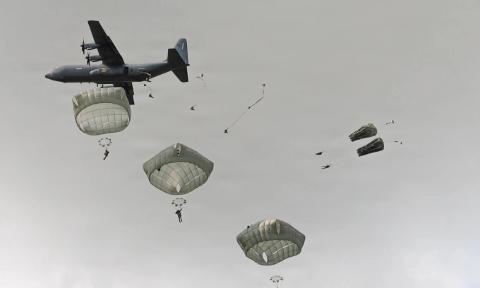 Binh sĩ thuộc Sư đoàn Dù 82 Mỹ nhảy dù từ máy bay C-130J tại Pháp tháng 6/2025. Ảnh: US Army