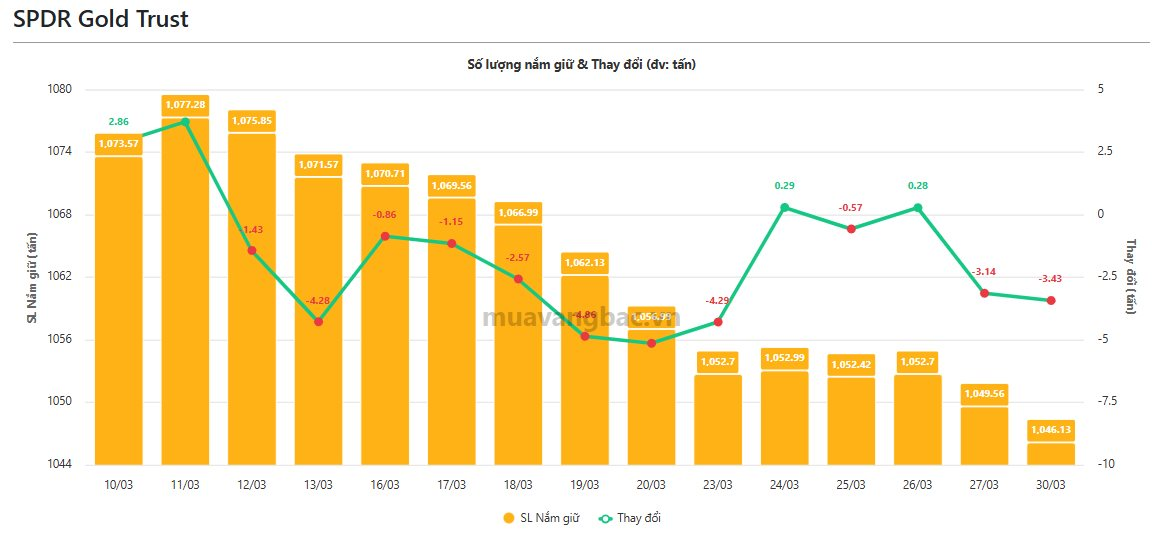 Theo cập nhật từ Muavangbac.vn, quỹ vàng lớn nhất thế giới SPDR Gold Trust tiếp tục bán ròng 3,4 tấn vàng trong ngày 30/3. Trong tuần trước đó (23/3-27/3), quỹ này đã bán ròng khoảng 7 tấn vàng. Hiện tại, SPDR còn nắm gần 1.046 tấn vàng.