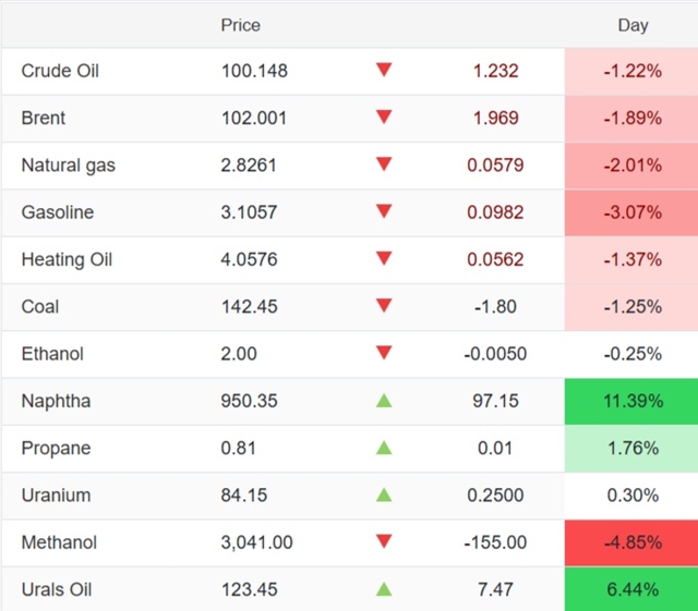 Theo dữ liệu từ các sàn giao dịch quốc tế, dầu thô WTI của Mỹ giảm 1,232 USD, xuống còn 100,148 USD/thùng, tương đương mức giảm 1,22%. Trong khi đó, dầu Brent giảm 1,969 USD về mức 102,001 USD/thùng (-1,89%).