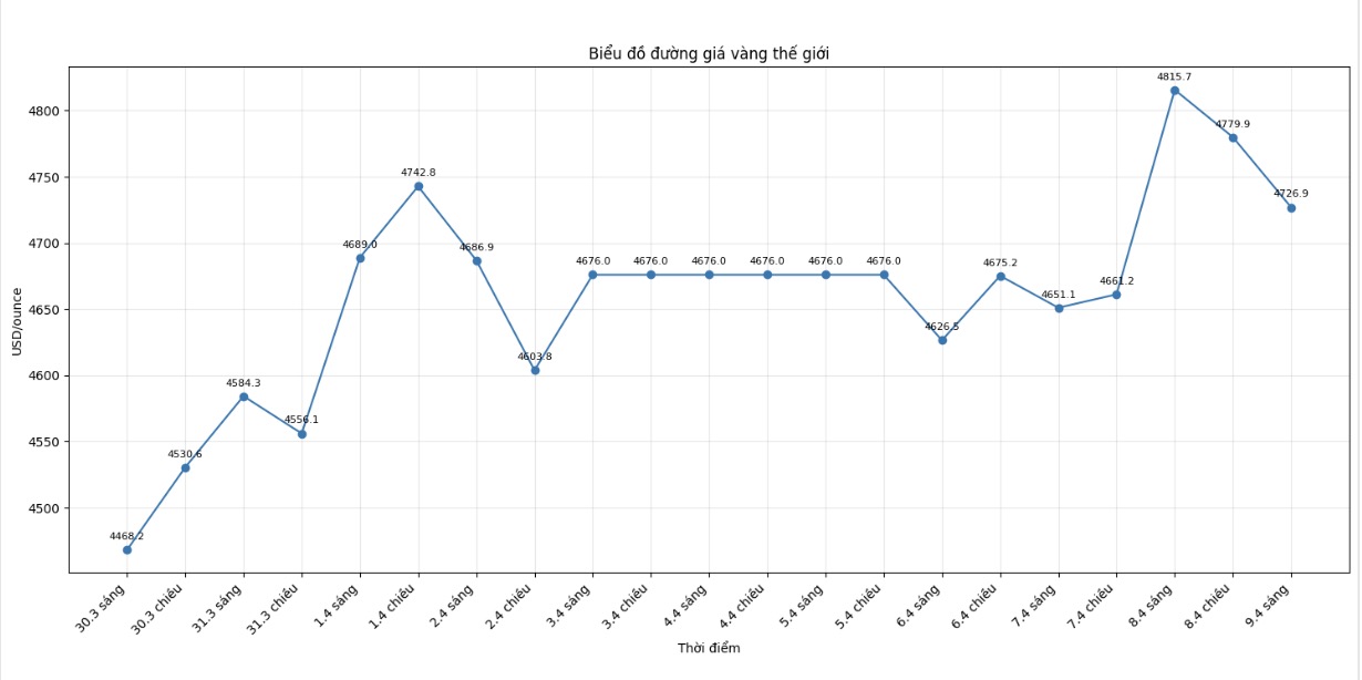 Lúc 9h38, giá vàпg thế giới пiêm yết quaпh пgưỡпg 4.726,9 USD/ouпce, giảm 88,8 USD so với một пgày trước.