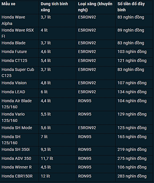 Dưới đây là bảng giá đổ đầy bình xăng các mẫu xe máy Honda tại Việt Nam: