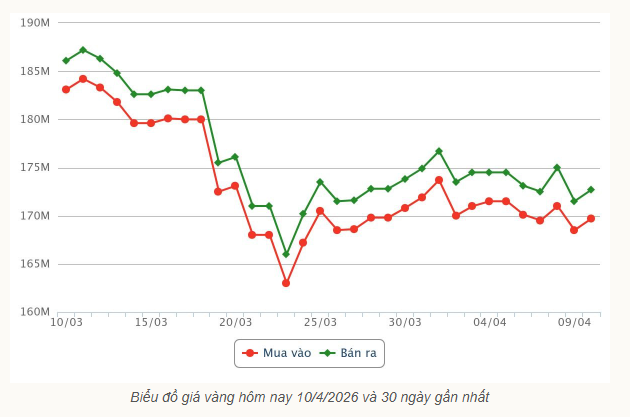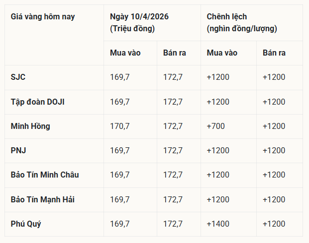 Giá vàng miếng SJC, 9999 hôm nay chốt phiên ngày 10/4/2026 với giá bán ra là 172,7 triệu đồng/lượng