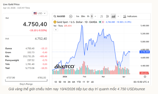 Giá vàng thế giới chiều hôm nay 10/4/2026 tiếp tục duy trì quanh mốc 4.750 USD/ounce