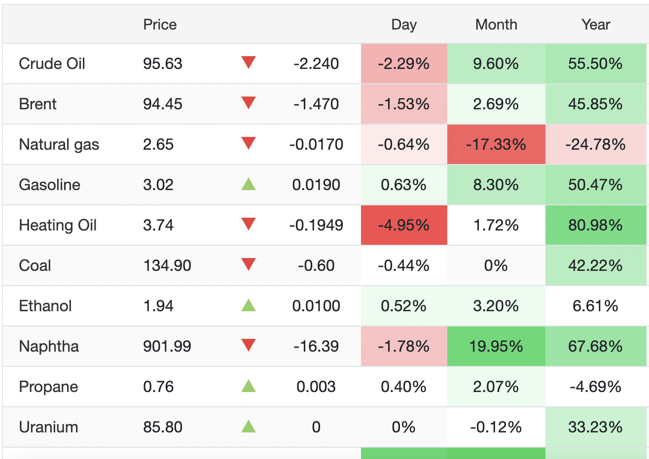 Tại phiên giao dịch hôm nay ngày 11/4, giá dầu trên thị trường quốc tế duy trì ở ngưỡng 94-96 USD/thùng. Lúc 7 giờ 00 sáng nay (theo giờ Việt Nam), trên Trading Economics, giá dầu WTI giao dịch tại 95,6 USD/thùng, giảm 2,2 USD/thùng, tương đương giảm 2,3% theo ngày. Dầu thô ngọt nhẹ Brent biển Bắc giao dịch ở mức 94,4 USD/thùng, giảm 1,47 USD/thùng, tương đương giảm 1,53% theo ngày.