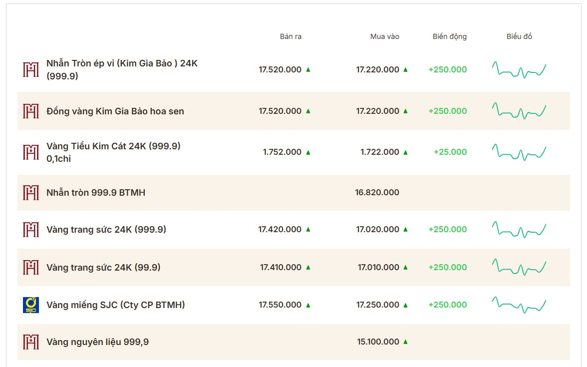 Hiện nay, giá vàng miếng SJC tại các doanh nghiệp lớn như PNJ, Công ty SJC và Bảo Tín Mạnh Hải đều đang được niêm yết phổ biến ở mức 170,5 triệu đồng/lượng ở chiều mua vào và 174,0 triệu đồng/lượng ở chiều bán ra. Tại Tập đoàn DOJI, mức giá áp dụng có phần thấp hơn ở chiều bán, niêm yết quanh ngưỡng 170,5 – 173,5 triệu đồng/lượng.