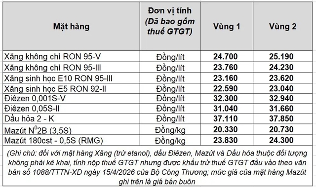Mức giá mới có hiệu lực từ thời điểm 00 giờ 00 phút ngày 16 tháng 4 năm 2026 cho đến kỳ điều hành giá xăng dầu tiếp theo của liên Bộ Công Thương – Tài Chính; được công khai tại website petrolimex.com.vn và các Công ty xăng dầu thành viên Petrolimex.