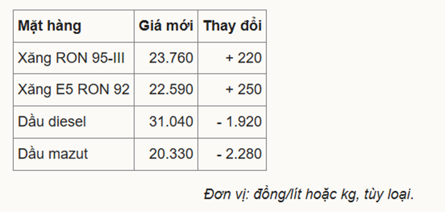 Giá xăng, dầu thay đổi như sau: