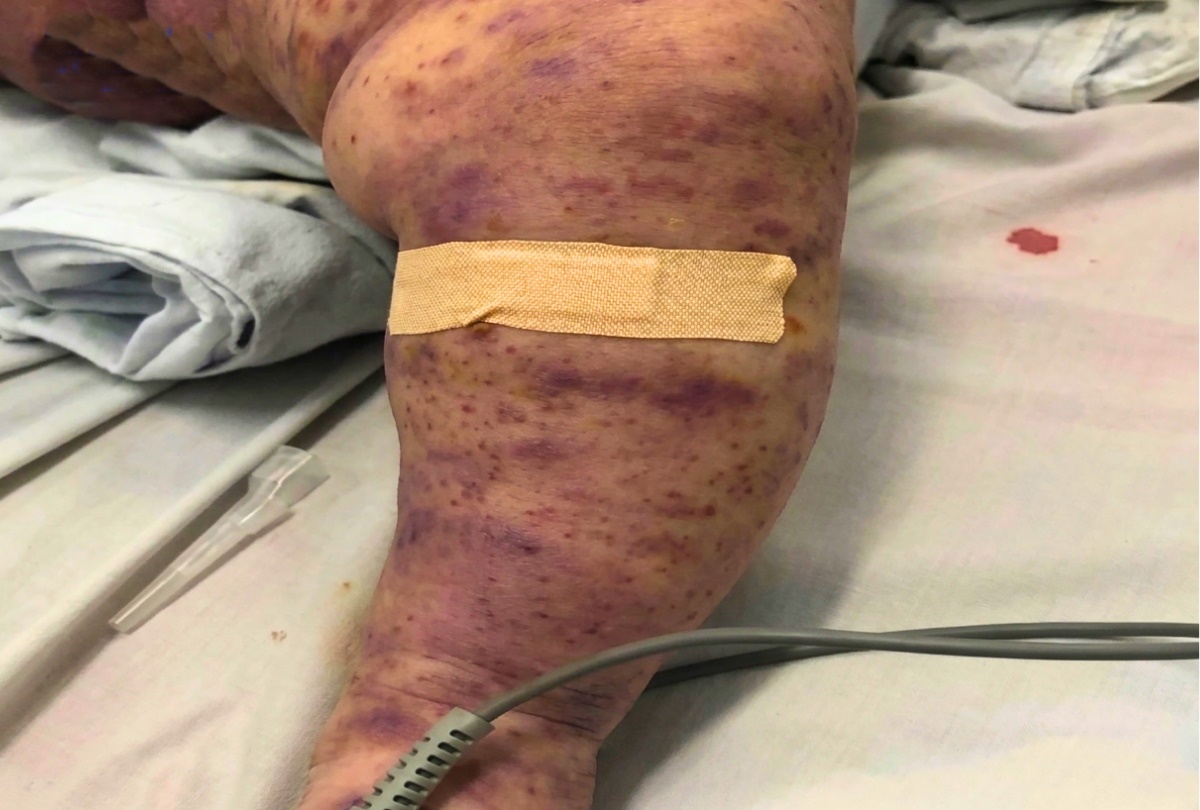 Khi bệnh tiến triển nặng, trẻ có thể xuất hiện các dấu hiệu nguy hiểm, điển hình là các ban màu tím sẫm trên da lan nhanh khắp cơ thể – Ảnh: VNVC