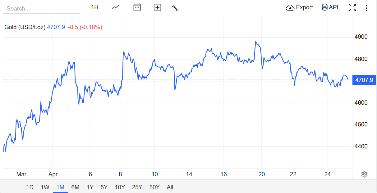 Giá vàng thế giới giao ngay chốt phiên tuần tại thị trường Mỹ vào rạng sáng hôm qua 25/4 (giờ Việt Nam) ở quanh mức 4.707 USD/ounce, giảm mạnh 123 USD/ounce so với chốt phiên tuần trước đó.